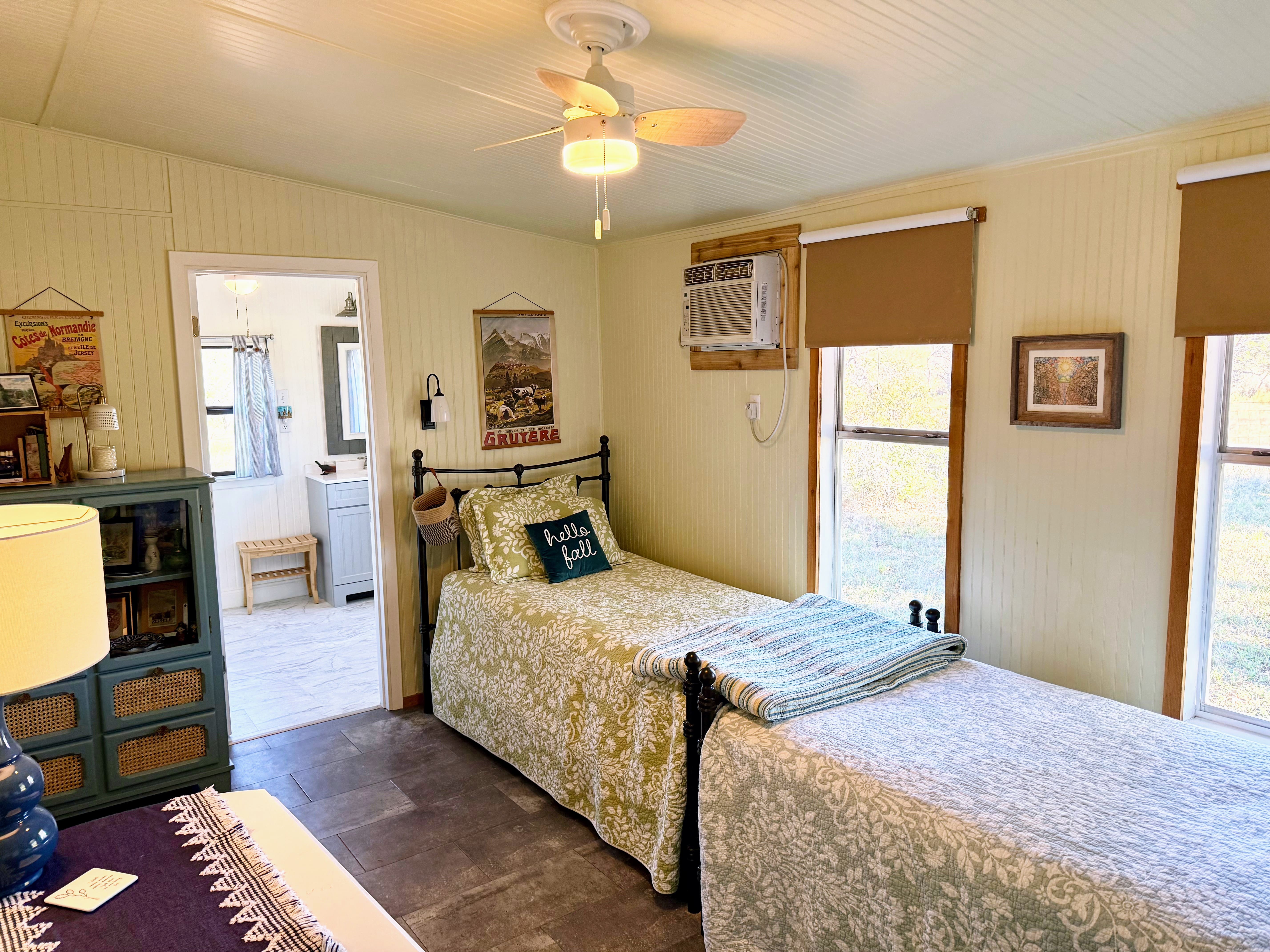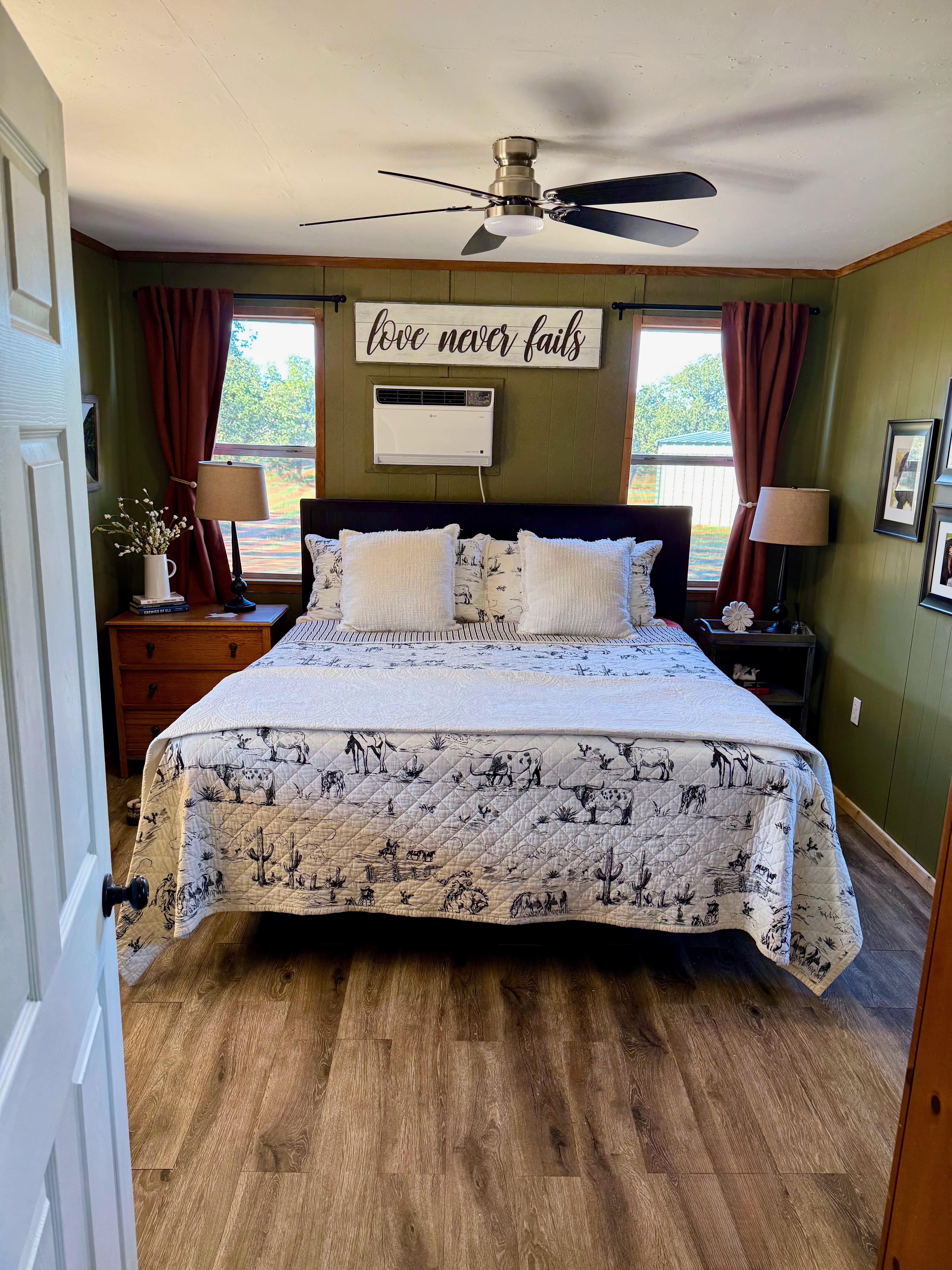 Additional improvements include a large equipment barn and a modest 2-bedroom home shaded by mature oak trees. The home provides functional living quarters that can serve as a weekend base, guest quarters, or a foundation for future improvements. A gated entrance and gravel drive add privacy and ease of access.