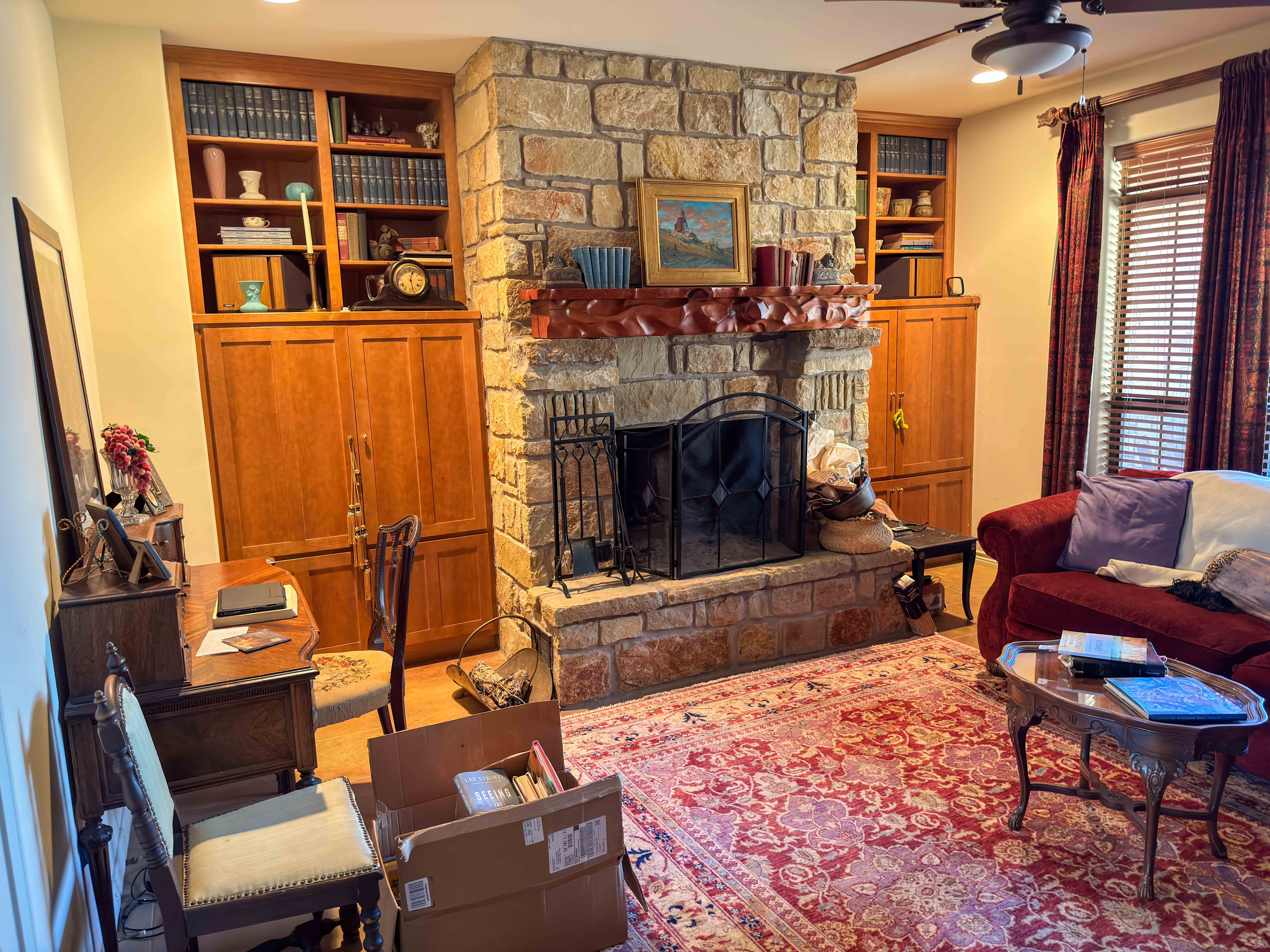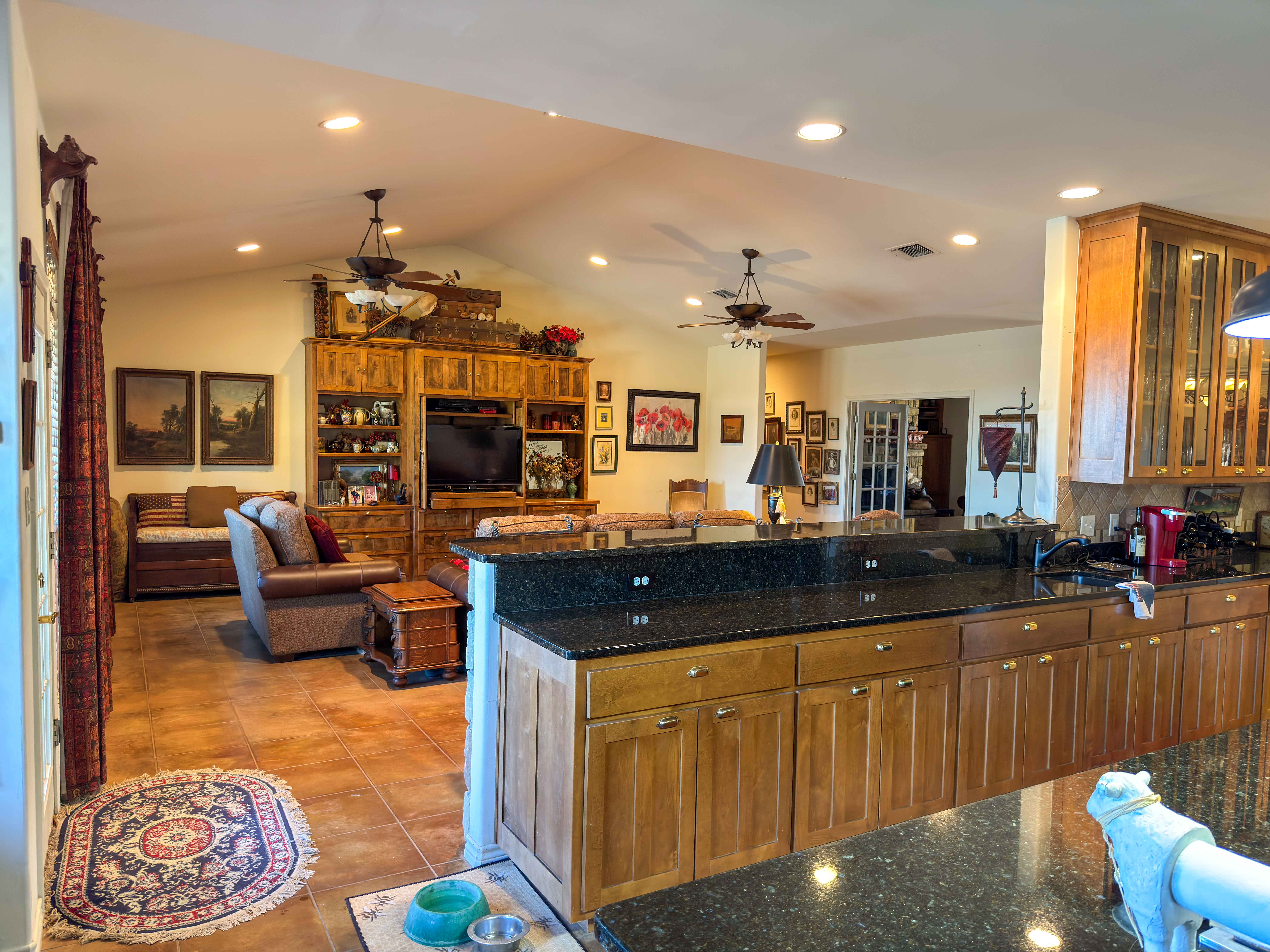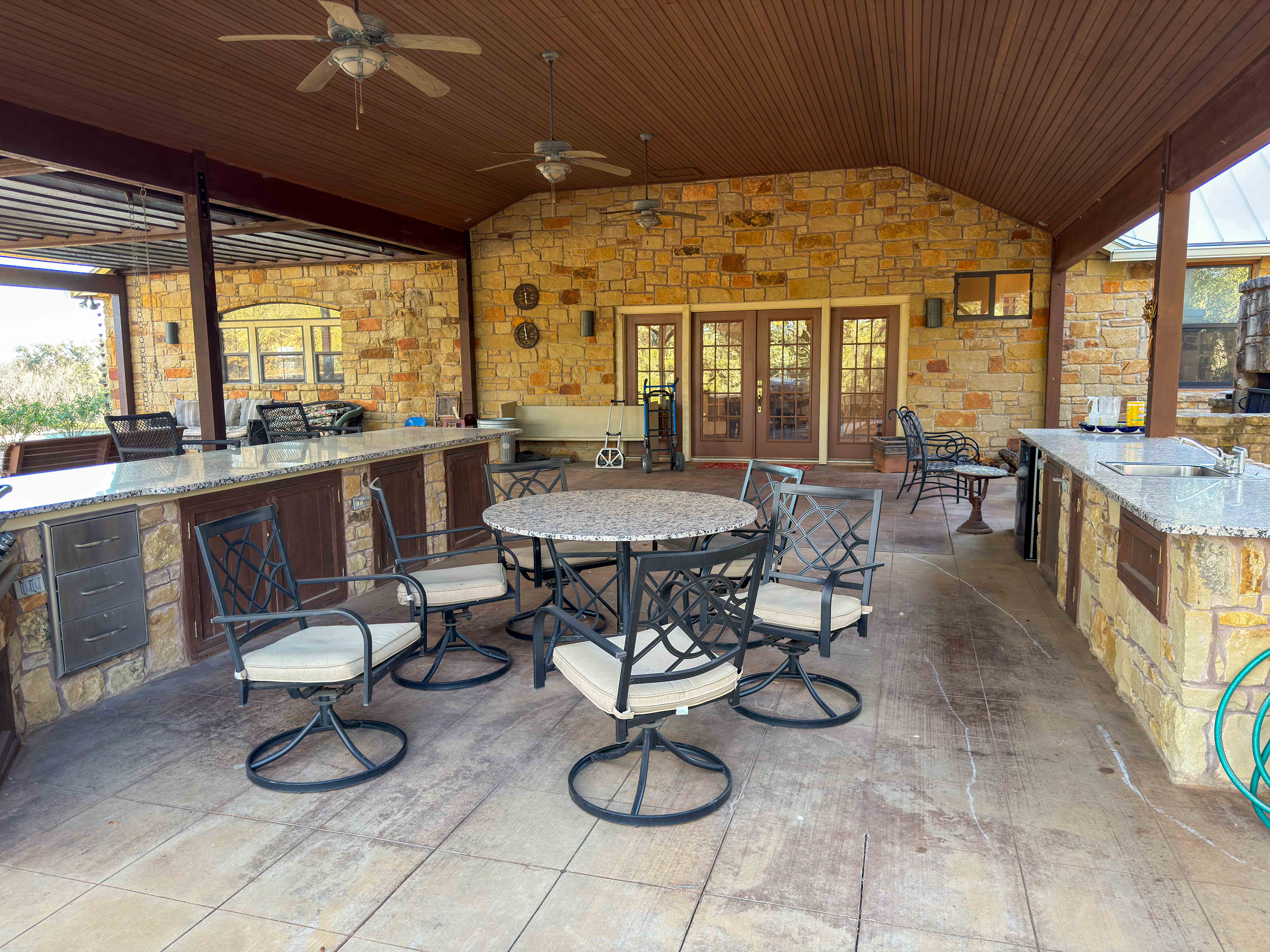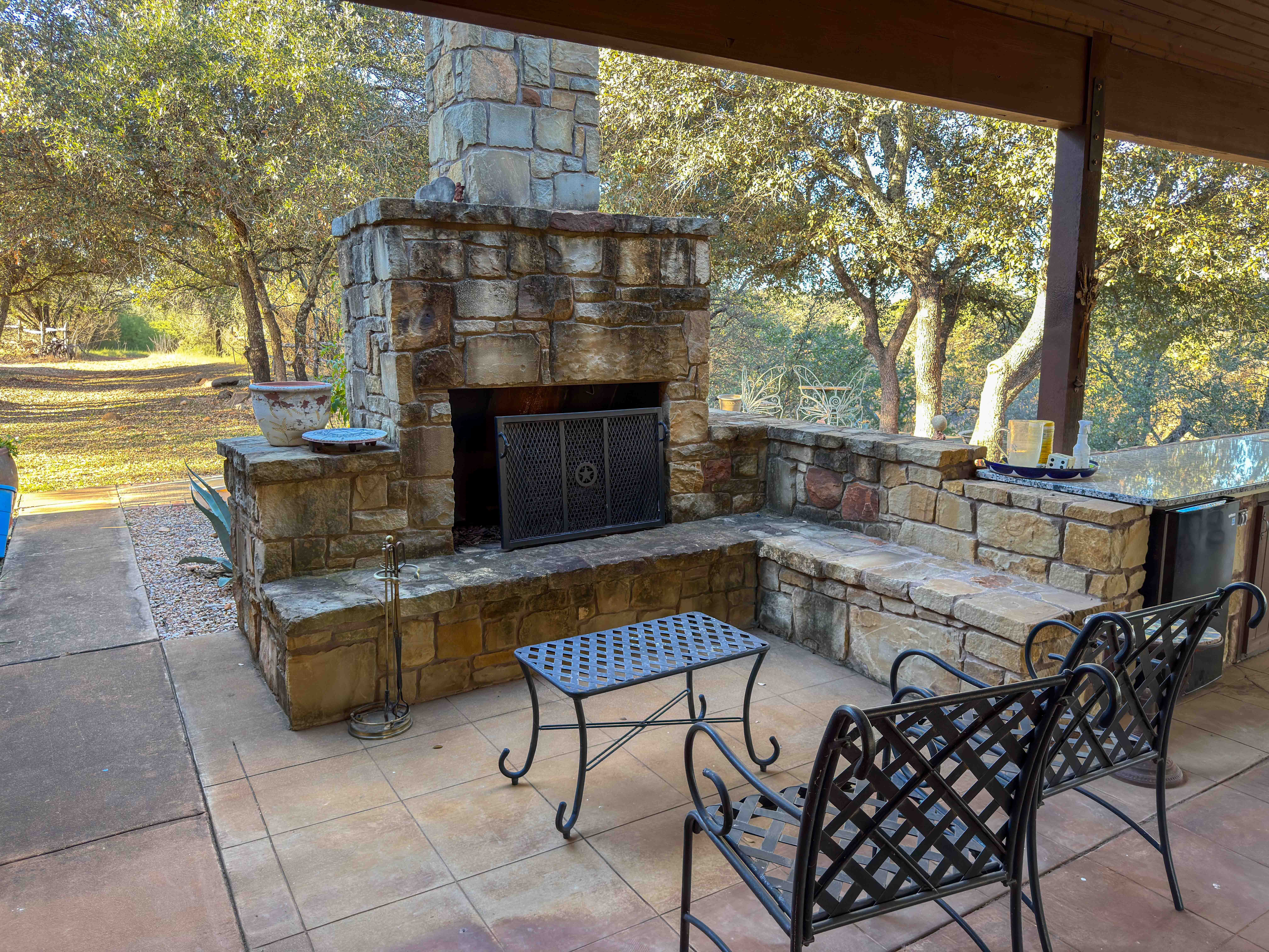 The heart of the home opens to exceptional outdoor living, where a covered porch with an outdoor kitchen and stone fireplace overlooks a solar-heated pool — creating a seamless space for entertaining or enjoying peaceful Hill Country evenings. A walk-in attic provides valuable storage and accessibility, while expansive windows capture scenic views of mature oak trees and the surrounding countryside.
