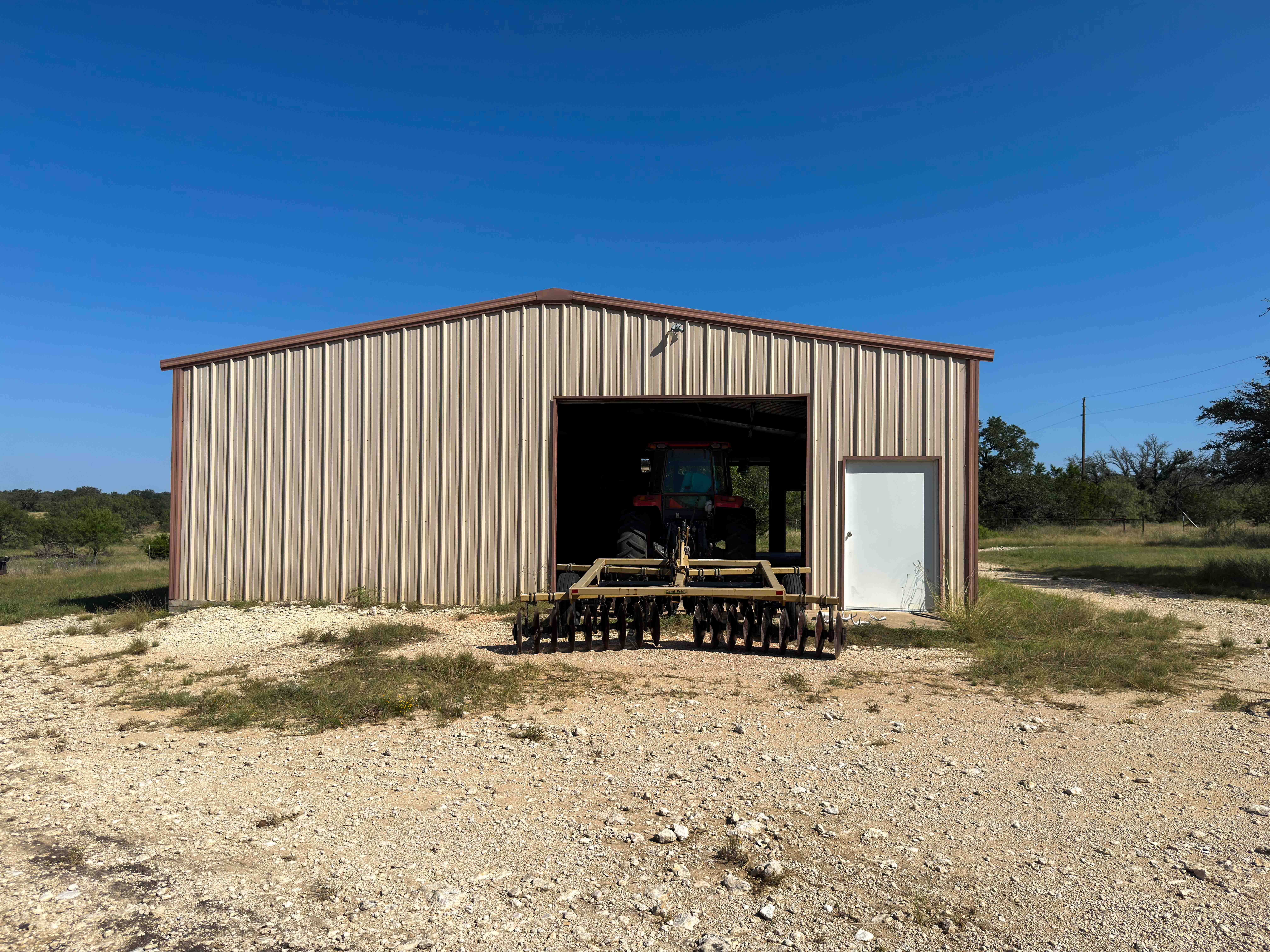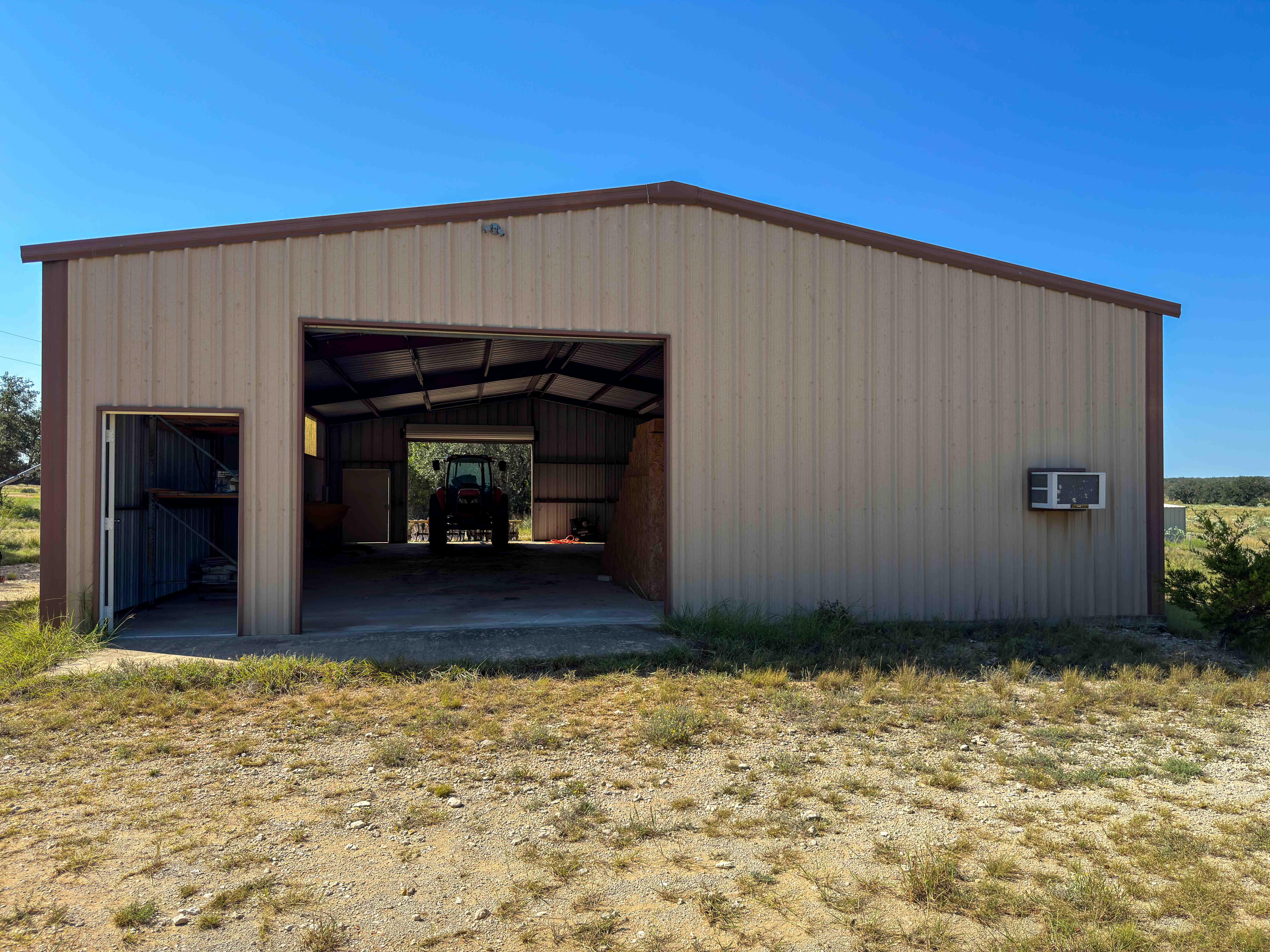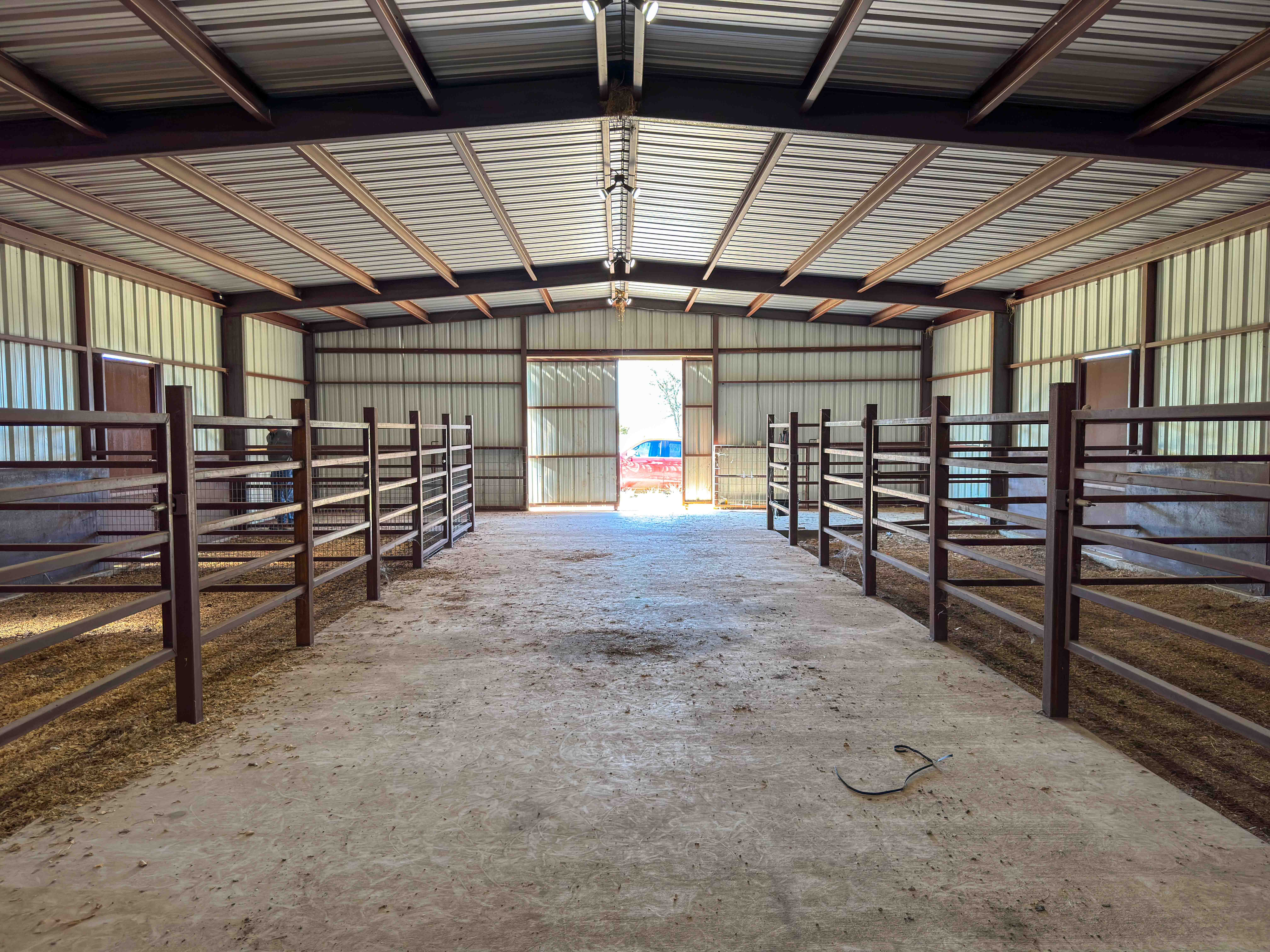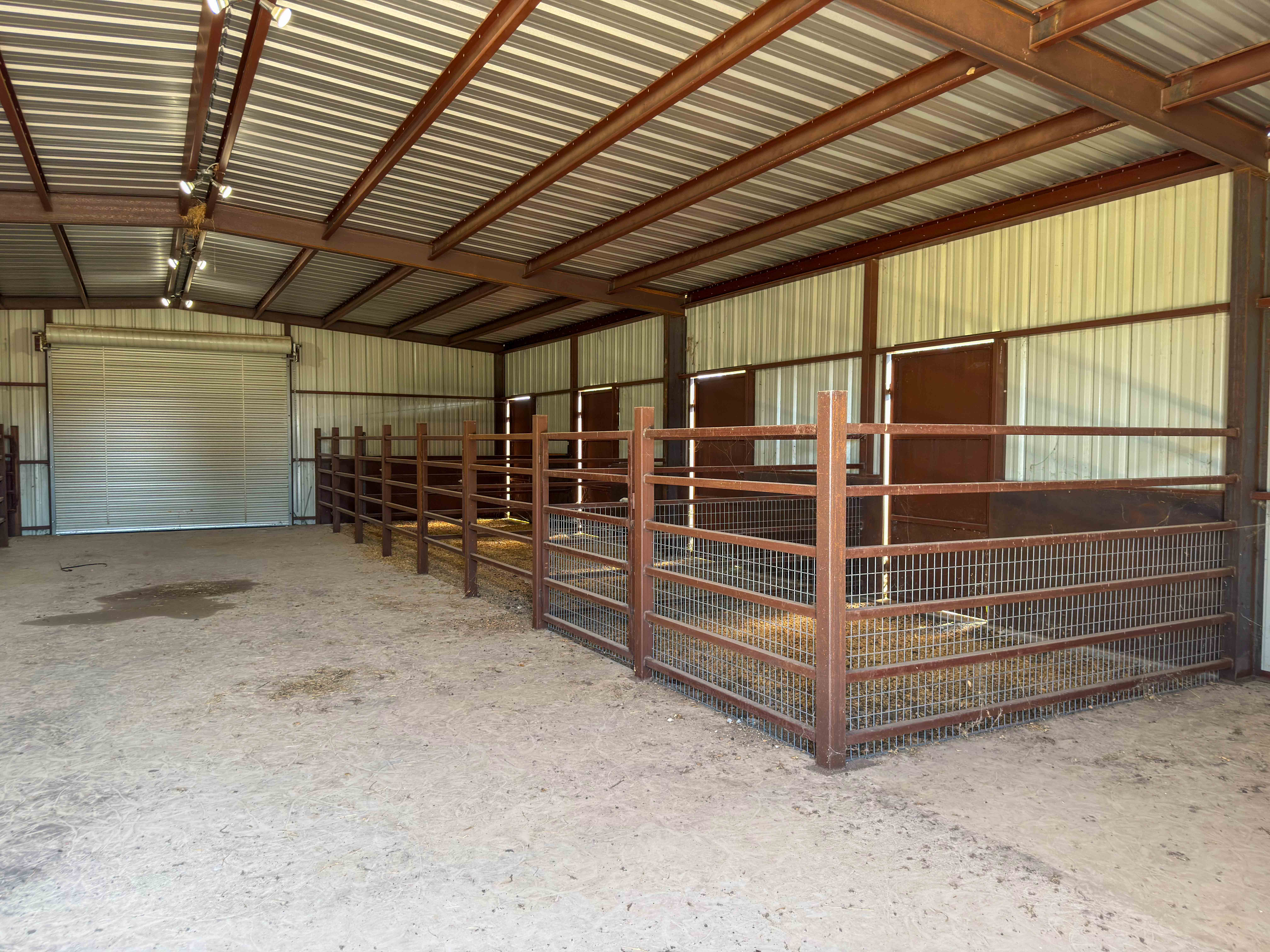 There is a metal equipment barn, and metal horse stables for 8 horses with outside pens for each horse. There is a circle pen for working the horses.