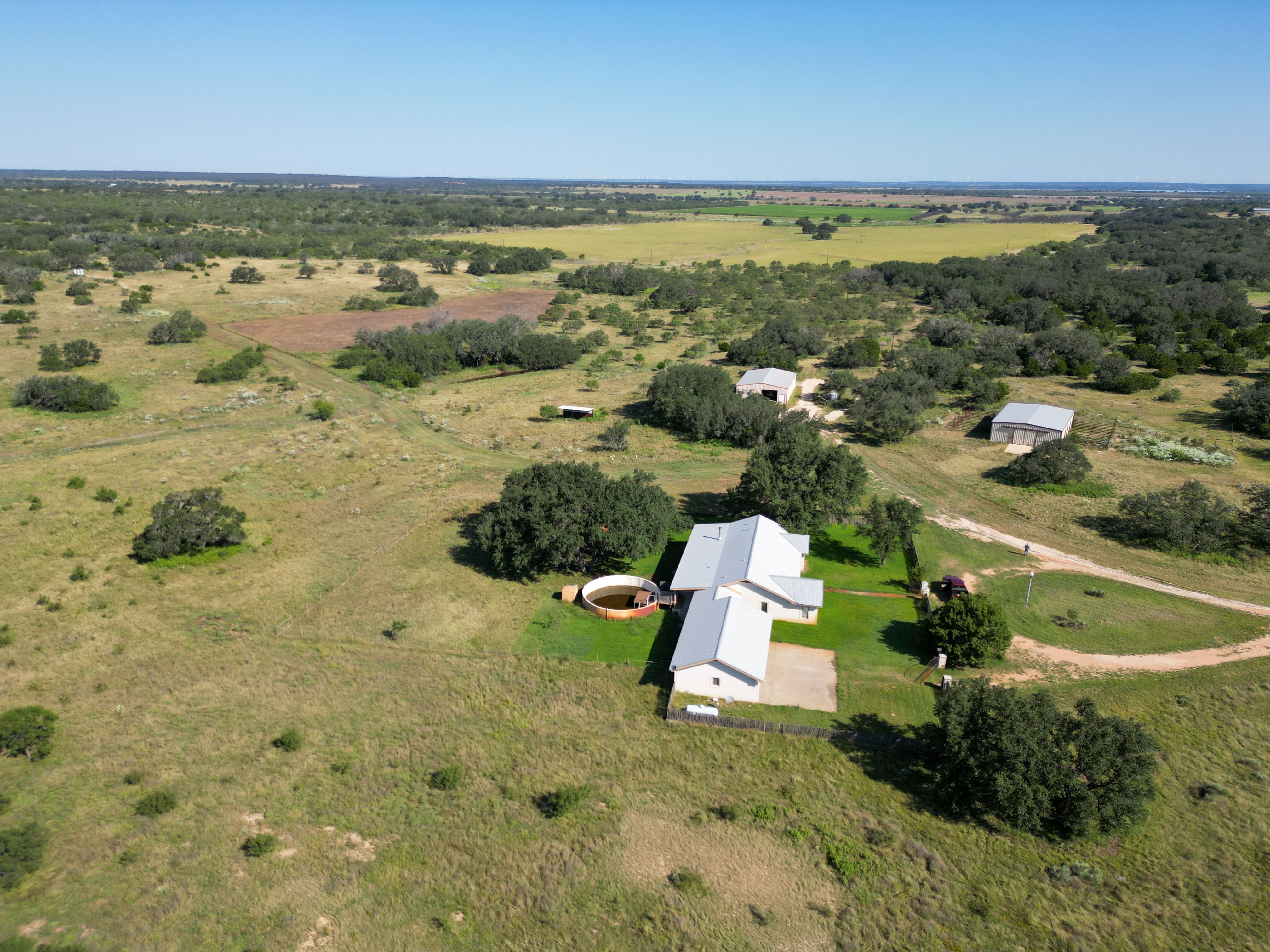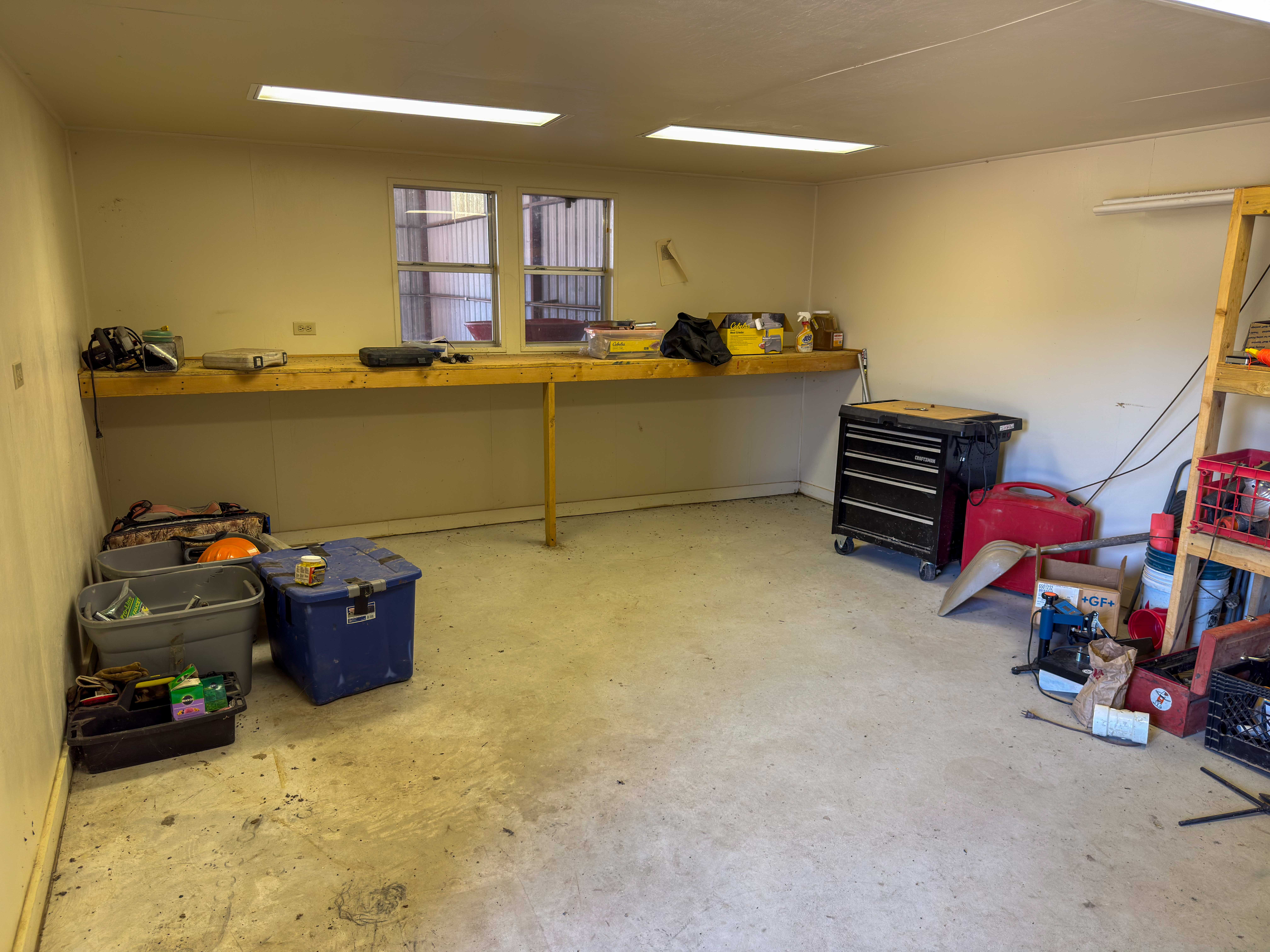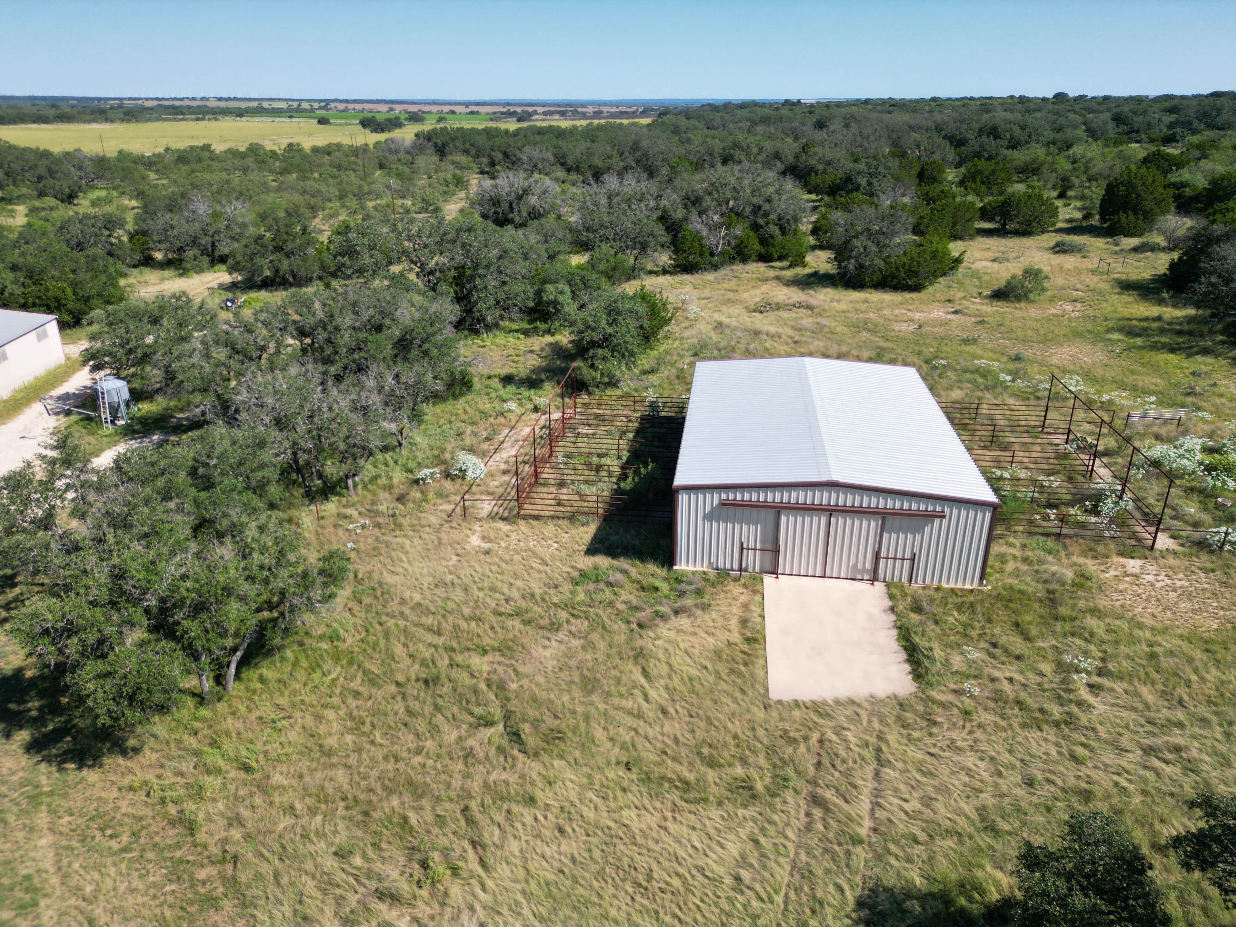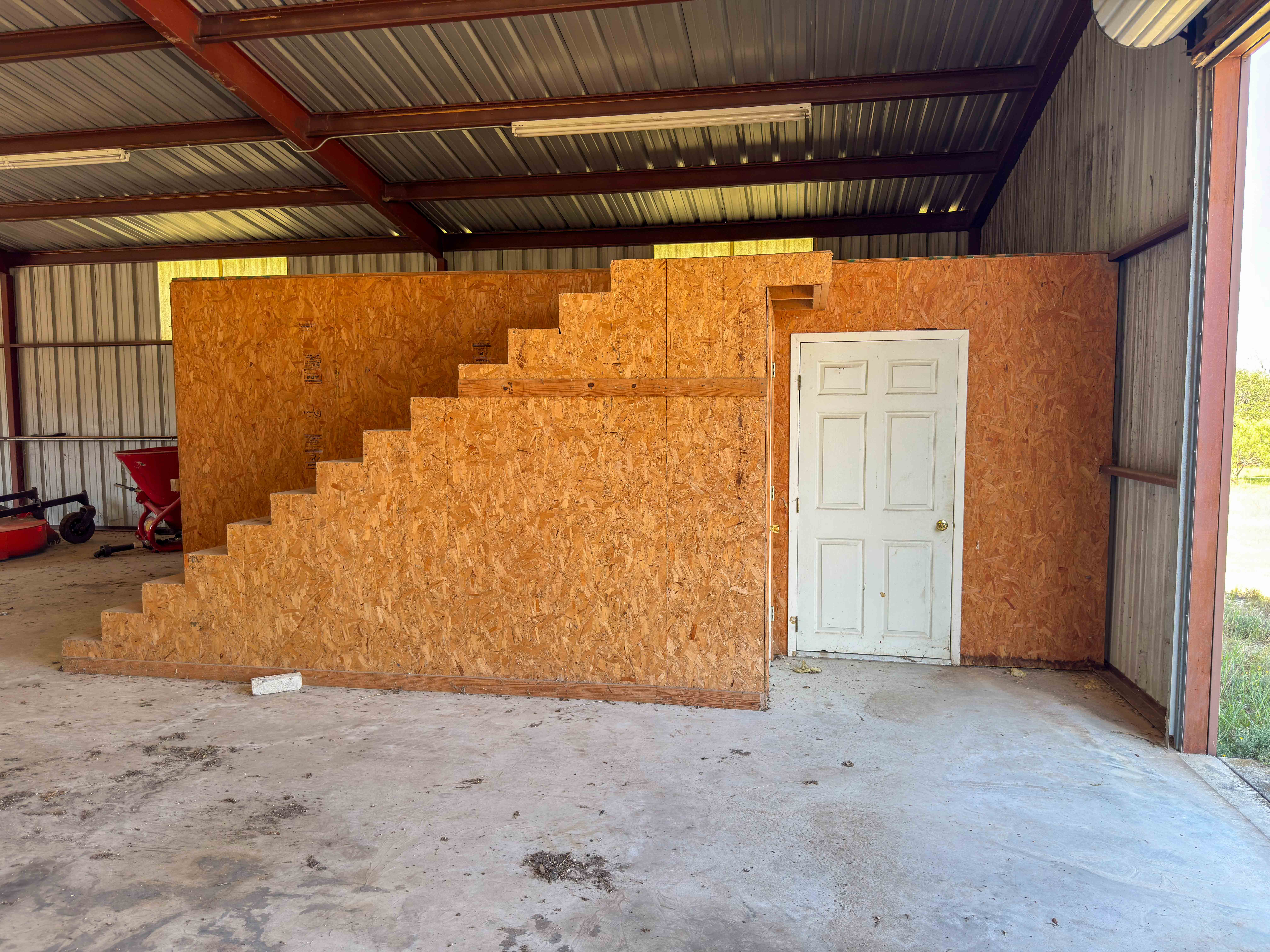There is a metal equipment barn, and metal horse stables for 8 horses with outside pens for each horse. There is a circle pen for working the horses.